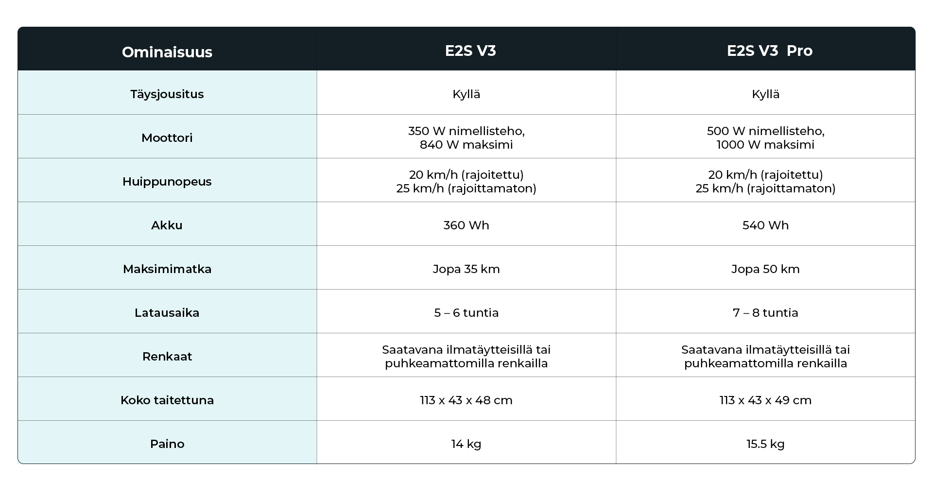E2S V3 -sarjassa on useita malleja, ja sinulle sopivin vaihtoehto riippuu siitä, miten ja kuinka usein käytät sähköpotkulautaa. Alla oleva yhteenveto auttaa sinua valitsemaan oikean mallin käyttöösi.